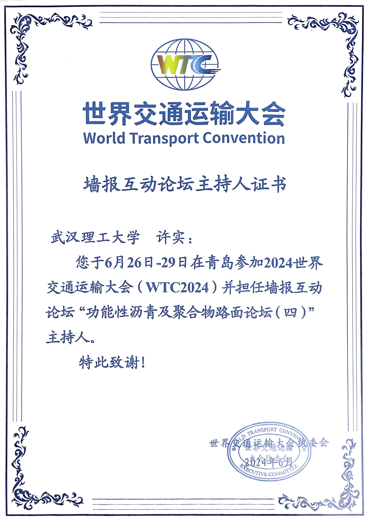 色情图 道桥系青年教师许实于26日至29日在青岛参加2024世界交通运输大会,并作为公路学部青年委员担任墙报互动论坛“功能性沥青及聚合物路面论坛(四)”主持人,并获得大会执委会的特别致谢,图为大会颁发的分论坛主持人证书以及许实在现场为报告嘉宾颁发报告证书的照片。