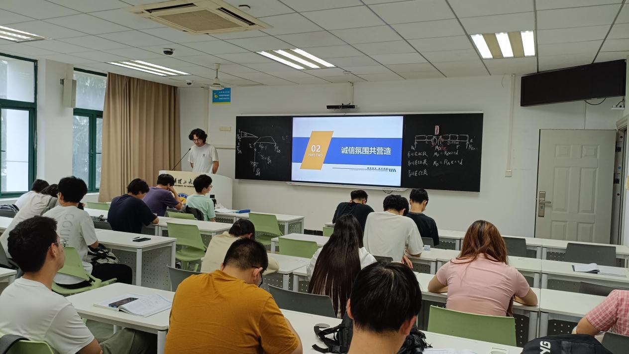 班会最后,班长呼吁全体同学严于律己,以诚信为笔,在考场上交出合格的人生答卷,为建设优良学风贡献力量。此次班会通过法理阐释、案例警示与行动引导相结合的方式,让同学们深刻认识到诚信考试的重要性。相信在即将到来的期末考试中,同学们一定能够以积极饱满的态度诚信应考。