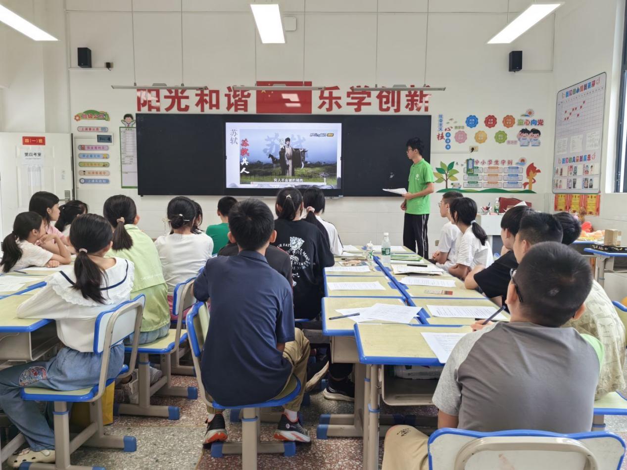 实践队员将话题转换为宋代大文豪苏轼。通过一段短视频,生动展现了苏轼跌宕起伏的一生。紧接着,实践队员细细解读了两首脍炙人口的词作《定风波·莫听穿林打叶声》与《水调歌头·明月几时有》,学生们在字里行间感受到了苏轼“竹杖芒鞋轻胜马”的洒脱与“但愿人长久,千里共婵娟”的期盼,心灵得到了洗礼和启迪。教学的高潮部分,实践队员聚焦于现代诗人陈毅的《梅岭三章》。学生们不仅学习了这三首激昂慷慨、催人奋进的诗篇,更在字里行间深刻体会到了革命先烈的崇高理想与坚定信念。陈毅将军的爱国情怀如同熊熊燃烧的火焰,点燃了学生们心中的爱国之情。