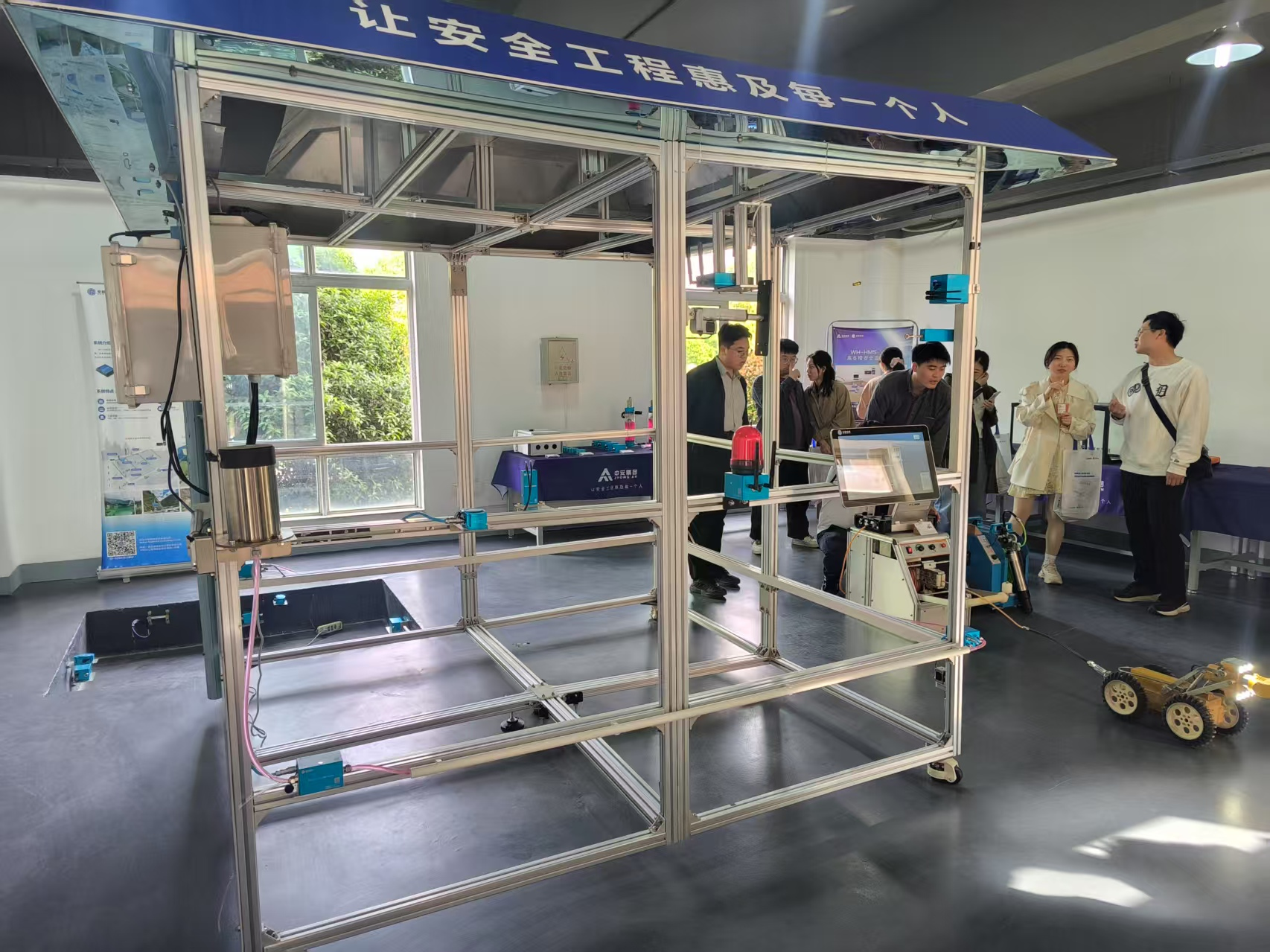 在智能装备研发中心,学生近距离接触高精度光纤光栅位移传感器、多轴力控机器人等尖端设备。中安集团技术总工杨涛演示了如何通过力控机器人完成微小空间内精密探测任务。在仪器展厅中,中安集团根据待监测的结构特征,自主研发制作实体模型,展示传感器布置、自动化监测及报警系统联动运作,使理论知识通过实物传达,使学员更好地理解及运用。